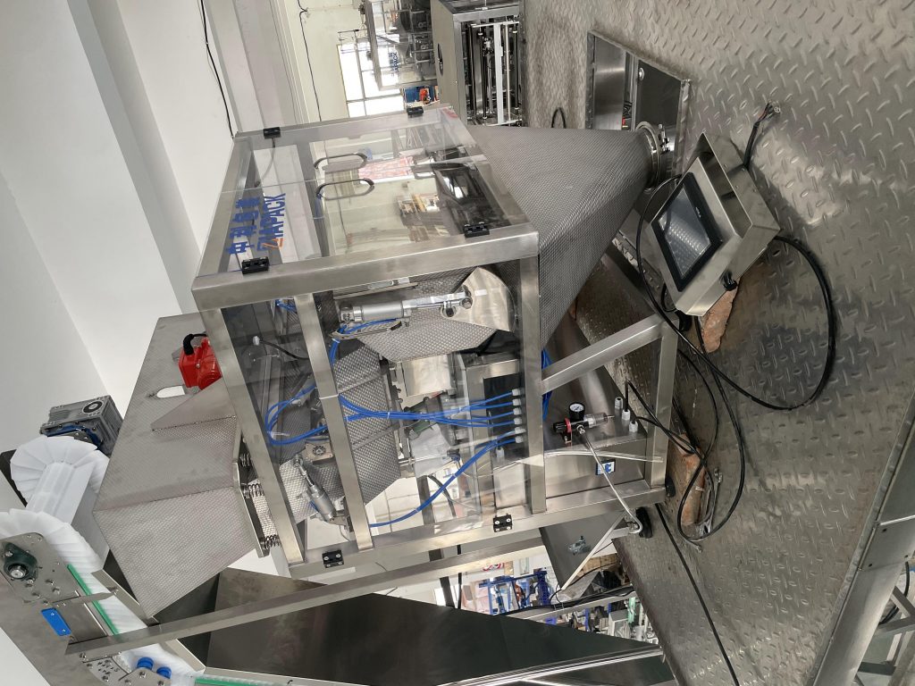 Tento jednotkový stroj je speciální konstrukce pro balení kostek ledu a ledové trubice do měkkého plastového sáčku. S funkcí podávání kostek ledu, vážením, plněním, automatickým těsněním sáčků a výstupem plného sáčku. Hlavní stroj má funkci počítání sáčků a kódování data .