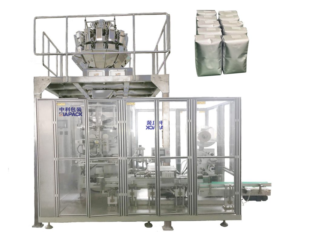 Celá linka včetně jedné sady plnicího plnicího stroje na výrobu sáčků vffs jeden balicí stroj na balení sáčků s nálepkami, jeden stroj na kontrolu hmotnosti a vyrovnávací dopravník a jeden stroj na balení do smrštitelné fólie. Celý stroj může automaticky dokončit vážení zrna, těsnicí nálepku pro vytváření sáčků a deformace . K tomuto jednotkovému stroji lze přidat další volitelnou funkci pro vakuové vakuování .