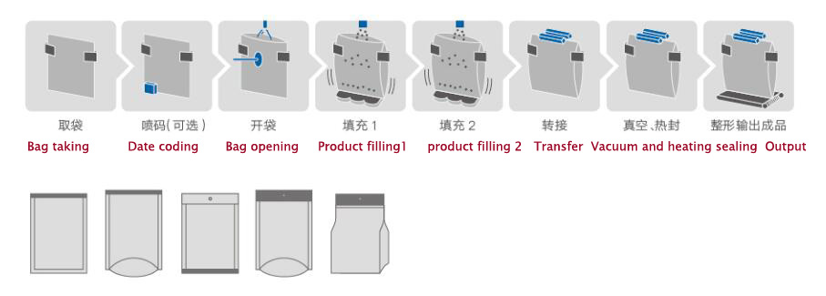 9、The packing materials loss low, what this machine is used the preformed bag, the bag pattern is perfect and has a high quality of the sealing part, this improved the product specification