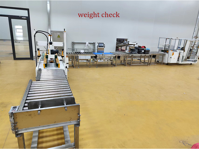 Po naplnění sáčků mraženými potravinami je každý sáček znovu zkontrolován detektorem hmotnosti, aby se zajistilo, že hmotnost odpovídá cílové hmotnosti, a poté prochází detektorem kovů, aby se zajistilo, že se do každého sáčku nepřimíchá žádný kov. Pytle jsou poté transportovány na linku plnění kartonů.