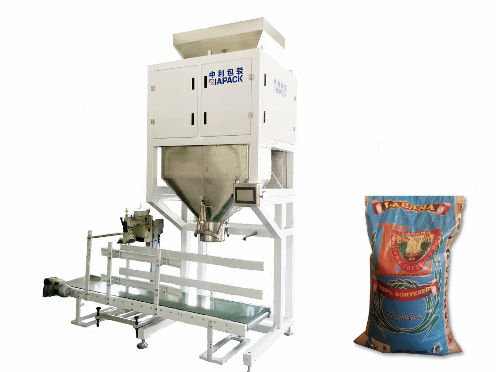 Tato strojní jednotka včetně jedné sady dvoukbelíkových vážících strojů pro měření 30-50 kg. Jedna sada 3metrového výstupního dopravníku, jedna sada vyhřívacího uzavíracího stroje PE sáčků a jedna sada stroje na sešívání jutových sáčků. Celý stroj může automaticky dokončovat vážení produktu, plnění produktu, automatické šití sáčku a tepelné utěsnění. Stačí ruční podávání sáčku.