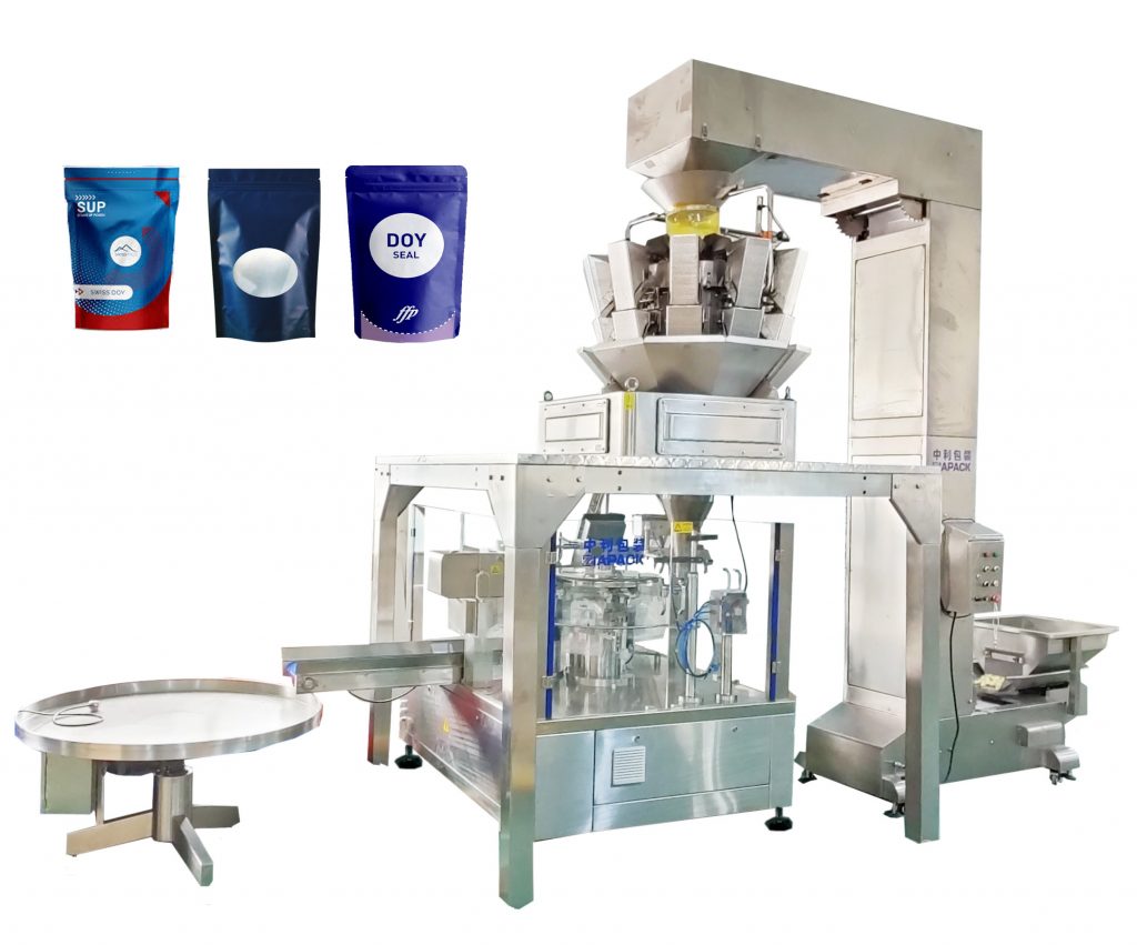 Předem připravený stroj na plnění a utěsňování pytlů, složený z 8 pracovních stanic s efektivitou a stabilitou, zdůrazňuje balení stojanu, zipového sáčku, sáčku na hadici a různých předem připravených sáčků. Spolupracuje s různými dávkovacími systémy (kombinovaná váha / lineární váha / šnekový šroub / plnící píst) a automatické zvedací dopravníky, je široce aplikována na granule, kapalinu a prášek.