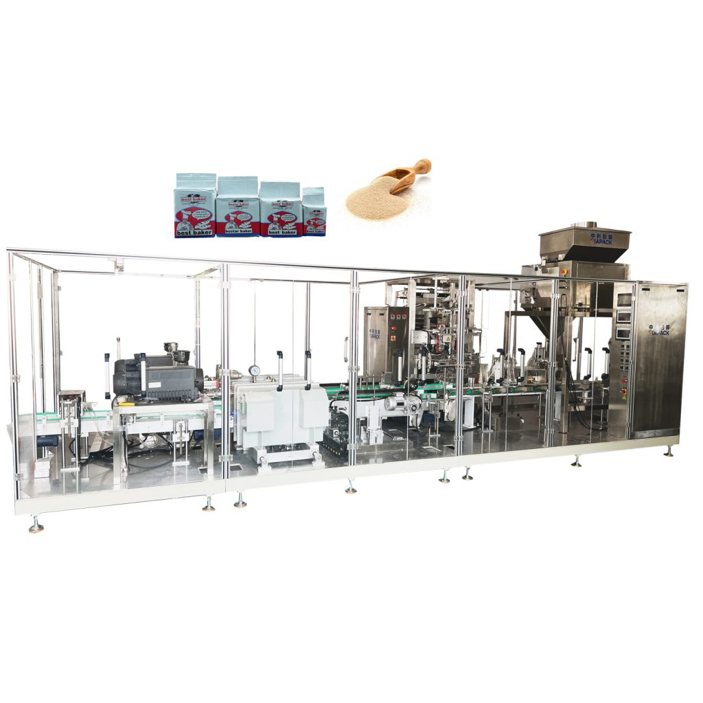 Tento stroj obsahuje jednu sadu vakuového elevátoru ZK3 pro podávání suchého droždí, jednu sadu ZL520 vertikálního balicího a uzavíracího stroje na výrobu sáčků. Jedna sada ZLC4-2000 čtyřkbelíková váha, jedna sada ZL-100V2 Dvojitá vakuová komora balicí stroj. Tento stroj je široce používán pro balení potravinářských farmaceutických chemikálií a jiných produktů v prášku nebo malých granulích. Jako kávový prášek, droždí, pšeničná mouka a tak dále. Celý stroj využívá uvnitř čerpání k vakuovému produktu. Stupeň vakua je velmi vysoký a rychlost balení je velmi vysoká, může dosáhnout 30 sáčků/min. Hotový výrobek má dlouhou životnost a pěkný tvar.