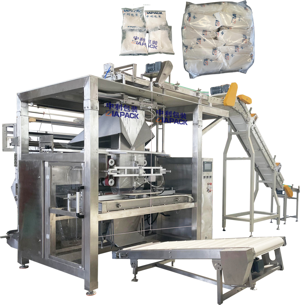Tento stroj je vhodný pro balení malého sáčku do velkého sáčku. Stroj dokáže automaticky vyrobit sáček a naplnit malý sáček a poté utěsnit velký sáček. Tento stroj včetně níže uvedených jednotek: